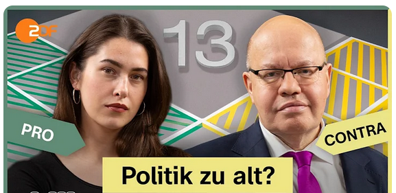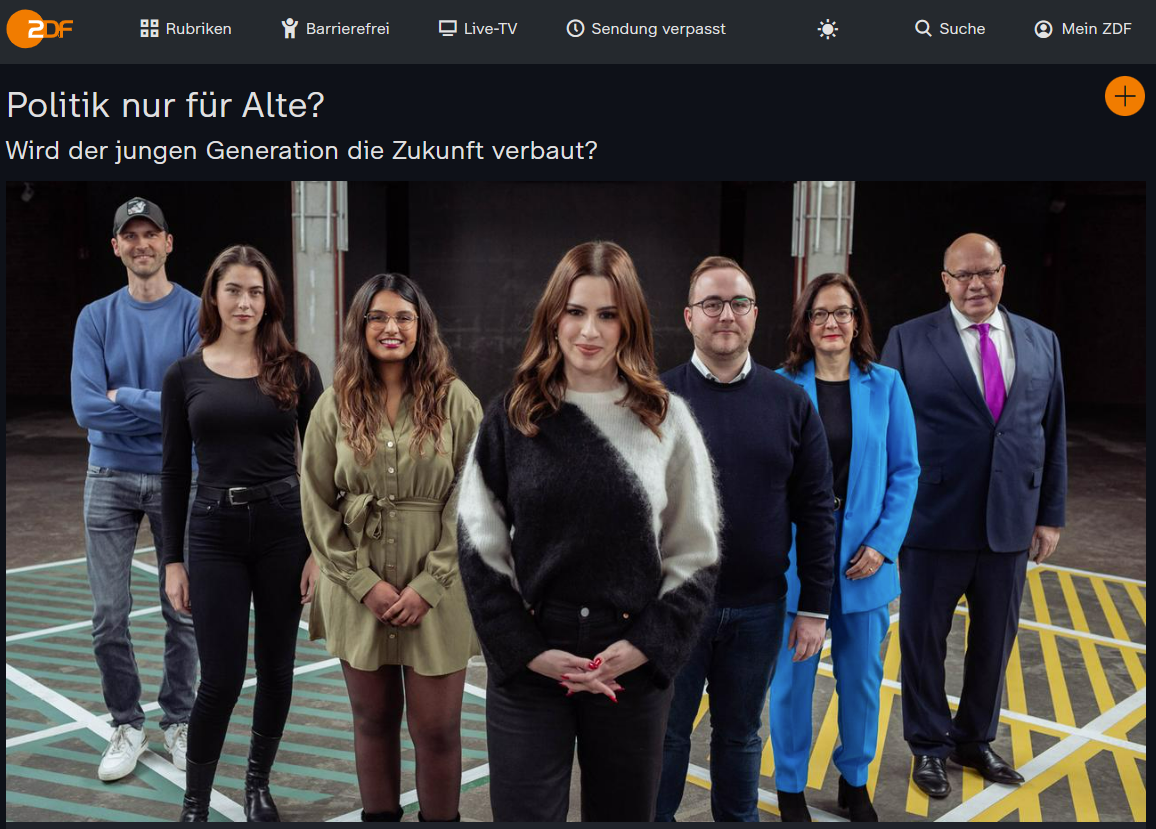 Unsere Rifka Lambrecht wurde zu dem ZDF-Debatten Format 13 Fragen eingeladen und hat u.a. mit Ex-Bundeswirtschaftsminister Peter Altmaier zu der Frage diskutiert: Wird in Deutschland hauptsächlich Politik von alten Menschen für alte Menschen gemacht?
