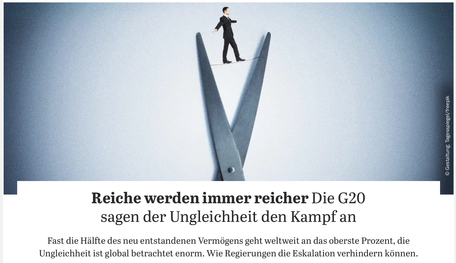 Unser Geschäftsführer Carl Mühlbach wird in einem aktuellen Tagesspiegel-Artikel zum Thema "Globale Ungleichheit" zitiert. Anlass ist der Bericht des Sonderausschusses unabhängiger Expert:innen der G20, der die wachsende Vermögensungleichheit weltweit beleuchtet.