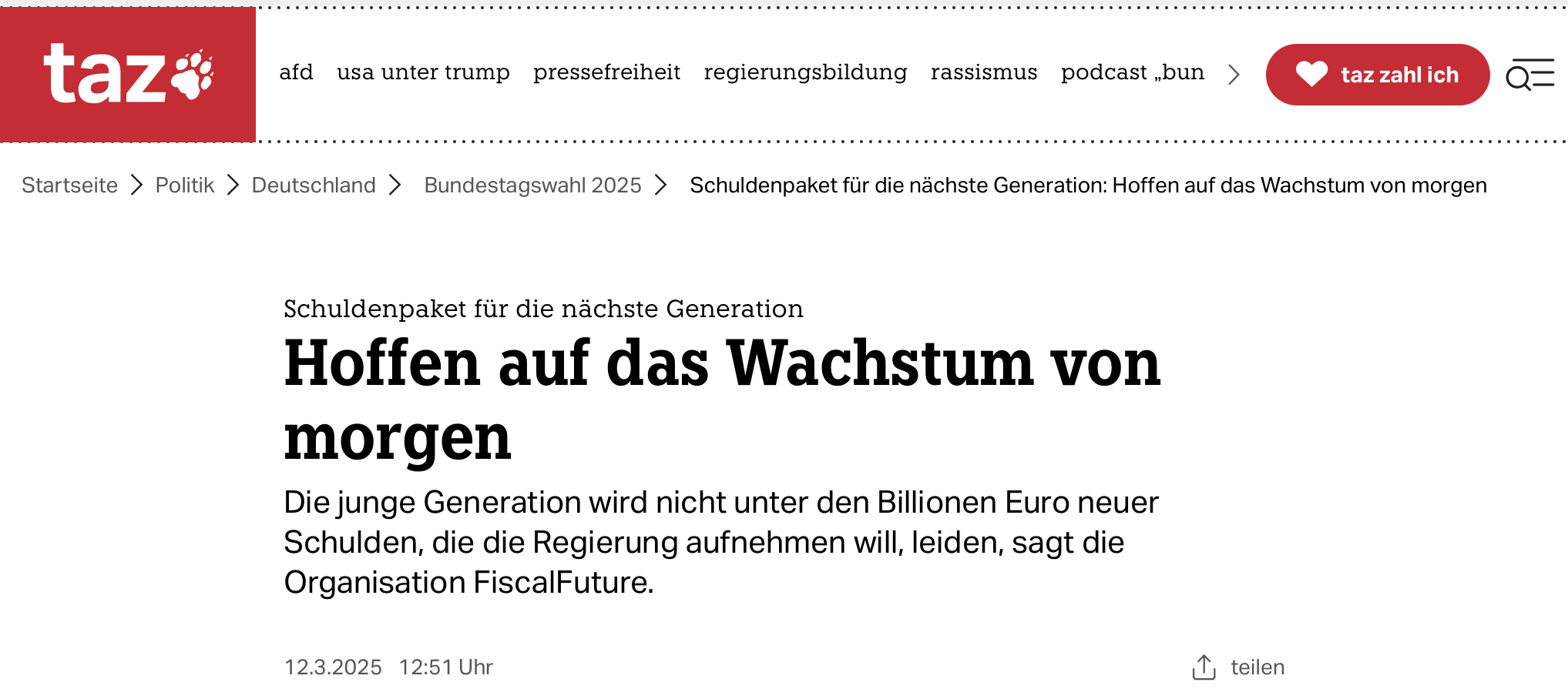 Carl Mühlbach, Gründer und Geschäftführer von FiscaslFuture, ordnet in der TAZ das Finanzpaket von CDU und SPD ein. Hierbei stellt er klar, das Investitionen zu mehr Wachstum führen und junge Menschen sich deshalb keine Sorgen um zu hohe Neuverschuldung machen müssen. Im Gegenteil: Letztendlich wäre es für die junge Generatione teurer, "wenn die kommende Regierung keine zusätzlichen Schulden aufnähme und nicht investierte".