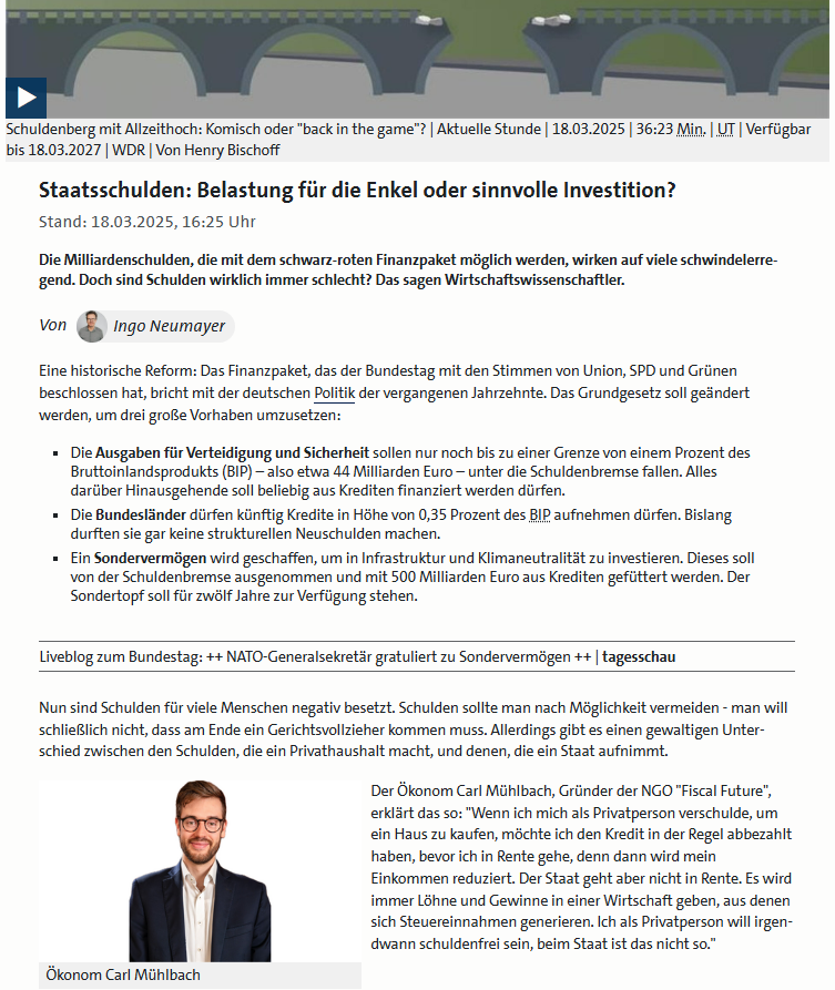 Ein WDR Beitrag von Ingo Neumayer zum Finanzpaket "Staatsschulden: Belastung für die Enkel oder sinnvolle Investition?" - Interviews mit den Ökonom:innen Carl Mühlbach, Philippa Sigl-Glöckner und Friedrich Heinemann