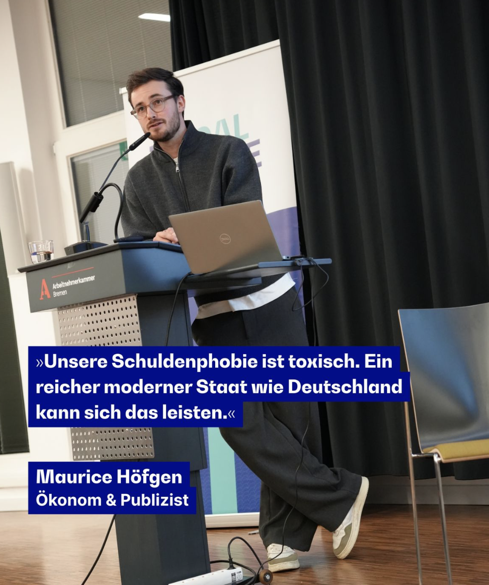Über Deutschlands Finanz- und Wirtschaftspolitik wird viel und leidenschaftlich diskutiert. An dieser Diskussion haben wir uns in der vergangenen Woche beteiligt. In Kooperation mit der Arbeitnehmerkammer Bremen haben wir ein hochkarätige Veranstaltung organisiert.