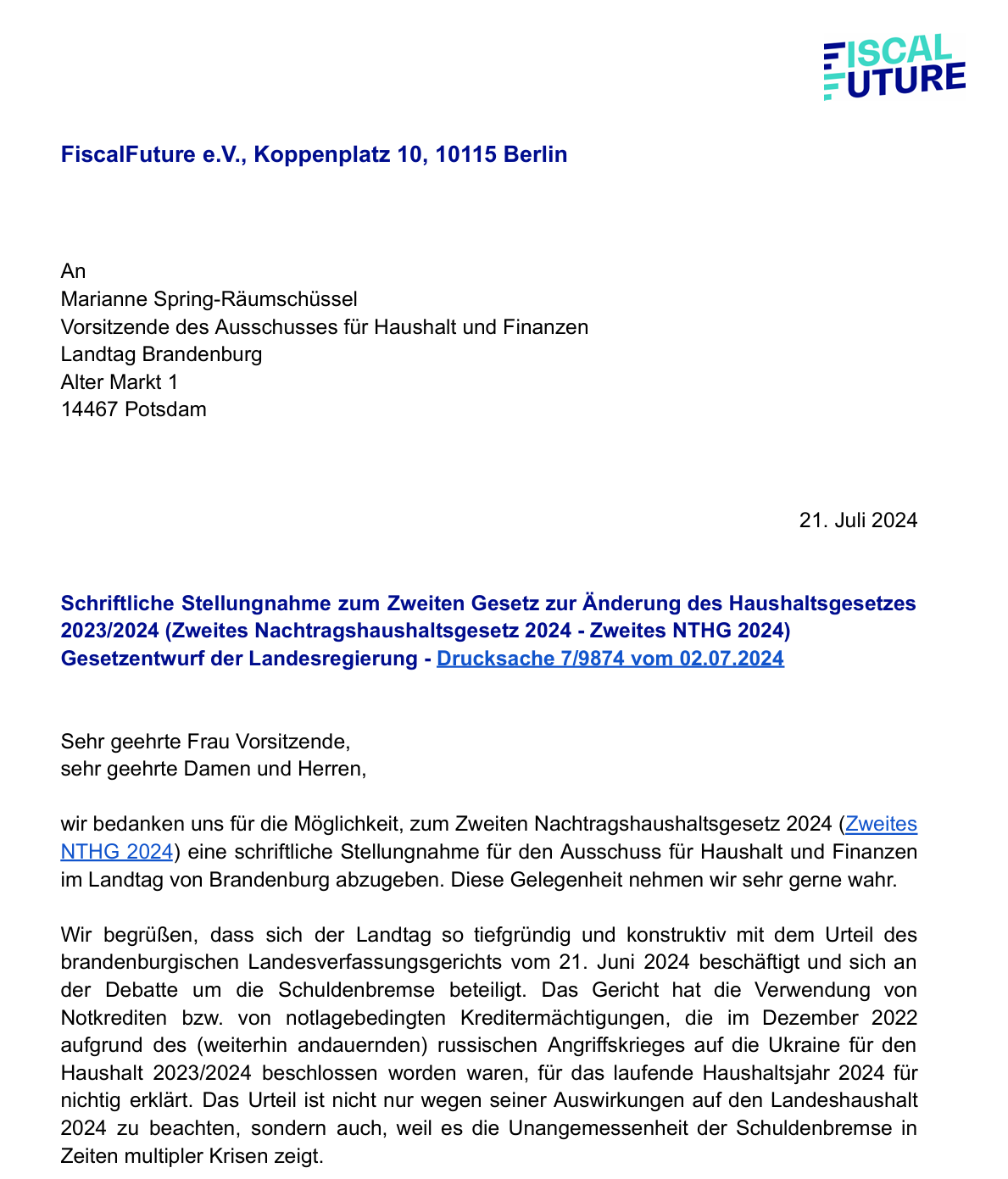 Stellungnahme für Brandenburg zum Nachtragshaushalt 2024